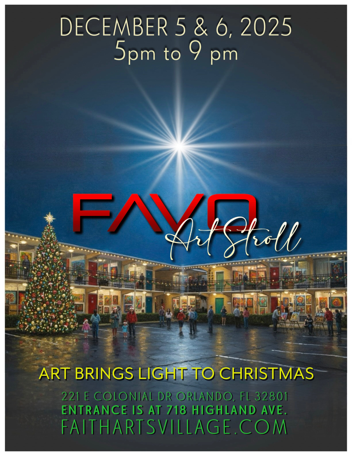 What is Faith Arts Village Orlando (FAVO)? FAVO is a collective of local artists who rent art studio rooms to express and show their message and talent. Here we provide affordable studio space and a place for local artists to display and sell their art! Contact us to inquire about renting an art studio for yourself.